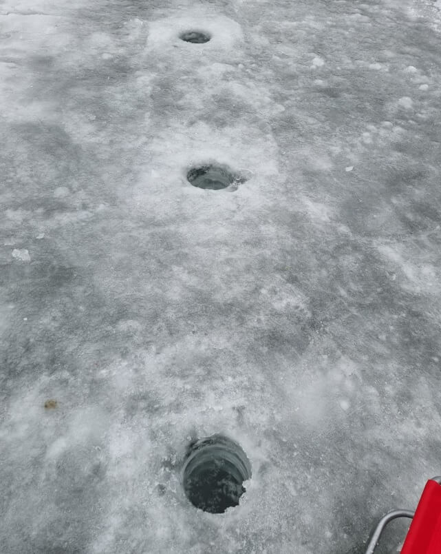 저수지 군데군데 구멍이 뚫려있어 빈자리에 자리잡고 낚시 준비를 합니다. 빙어는 무리를 지어 생활하기 때문에 낚시터에 사람들이 많이 몰려있는 곳에 빙어도 많이 있다고 하더라고요. 사람들이 없는 곳에는 빙어가 아예 한 마리도 없어요. 처음에 그걸 몰라서 한적한 곳에 자리를 잡았더니 정말 한참 동안 한 마리도 못 잡았어요.
