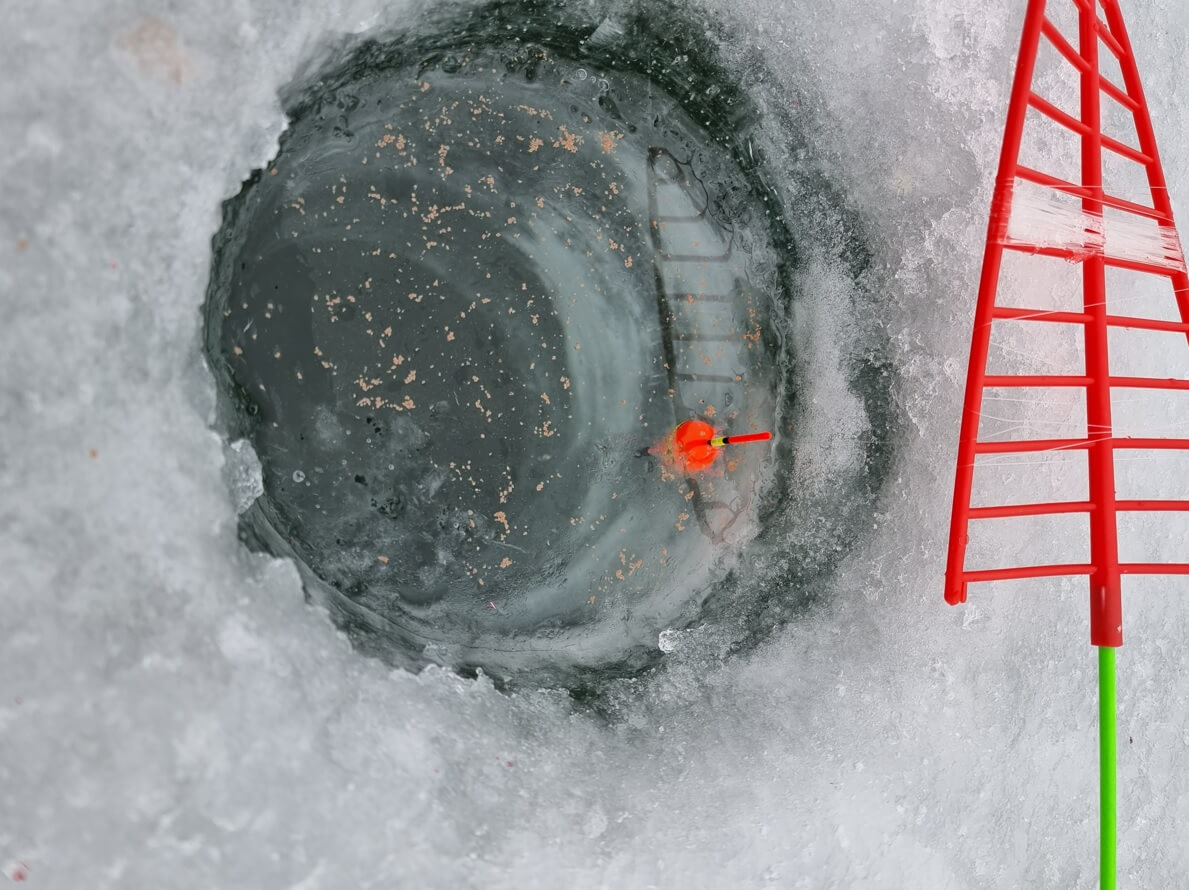 얼음구멍에 빙어 떡밥을 살살 풀어넣고 굼벵이를 끼운 바늘을 내려주면 지금부터는 기다림의 시간입니다. 빙어 떡밥이 물에 천천히 가라앉으면서 빙어를 모으고 있어요. 물이 어찌나 맑은지 얼음구멍을 보고 있으면 물 밑으로 지나가는 빙어들이 아주 잘 보여요. 미끼를 지나치거나 살살 건드리기만 하는 빙어들을 보고 있으면 애가 타죠
